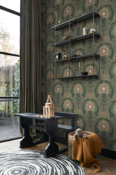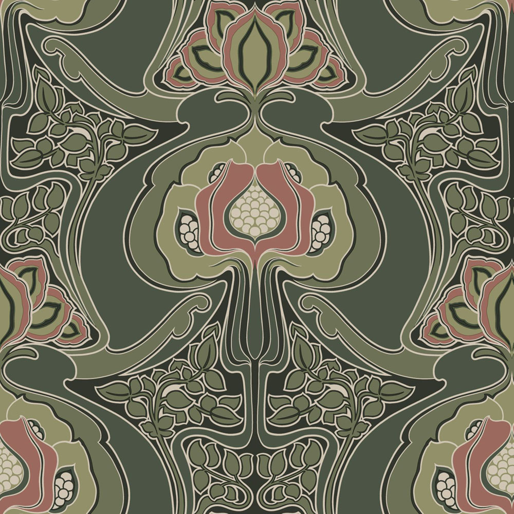Non-woven wallpaper with Art Nouveau floral pattern in shades of green and brown-pink.