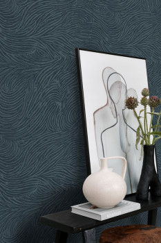 Smooth, blue, non-woven wallpaper, wave motifs.