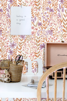 Smooth white non-woven wallpaper, a pattern of meadow flowers in shades of brown, beige, pink, purple and brick.