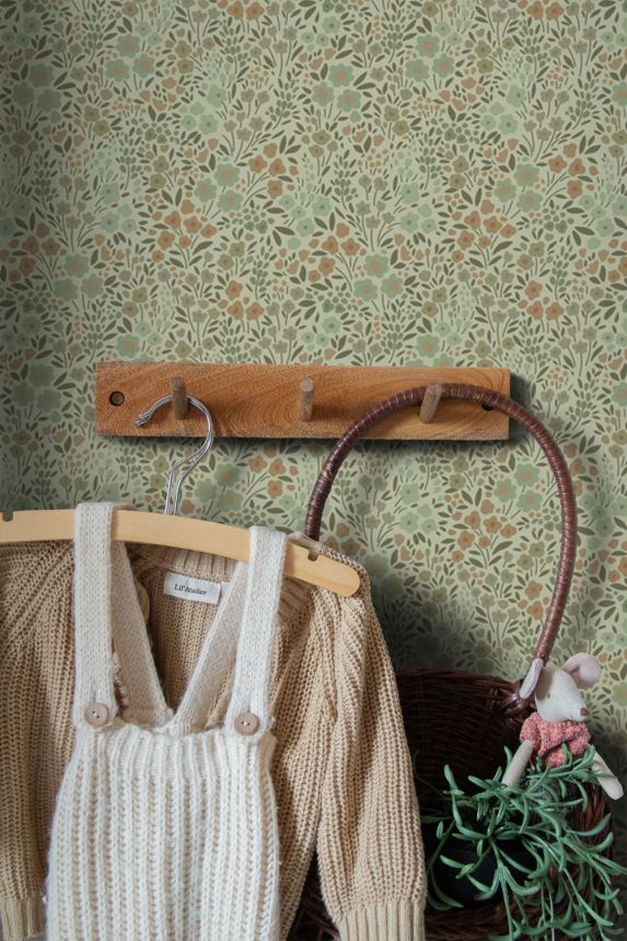 Green smooth non-woven wallpaper, floral pattern in shades of green and beige.
