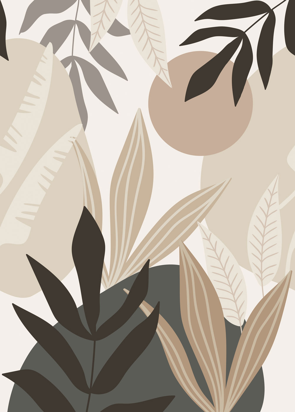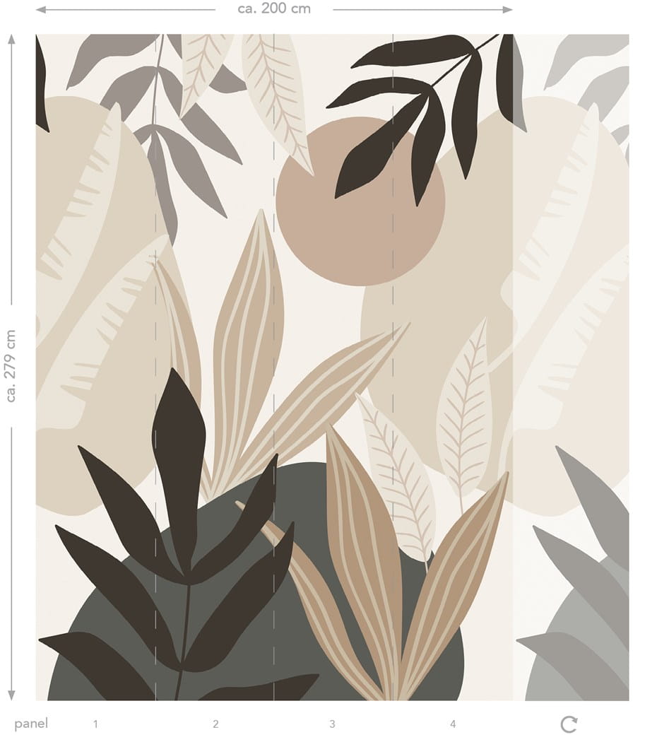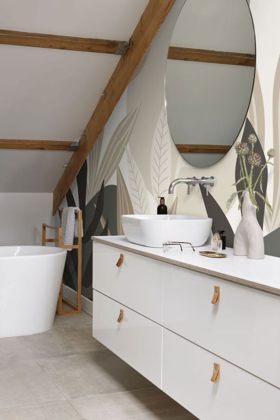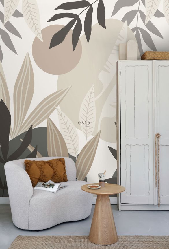 Non-woven wallpaper, motifs of leaves in shades of beige, black and gray.
