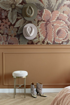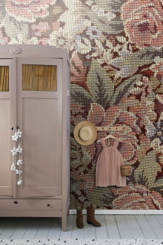 Floral non-woven wallpaper, shades of pale pink, wine and beige, the pattern evokes old tapestries.