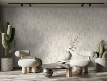 Luxury geometric non-woven wallpaper with vinyl surface, effective alternation of embossed textures, gray-beige shades.