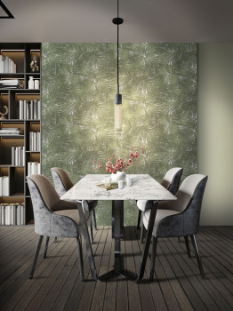 Luxury non-woven wallpaper with vinyl surface, motif of cream palm leaves on a shiny pearl background with effective interweaving.