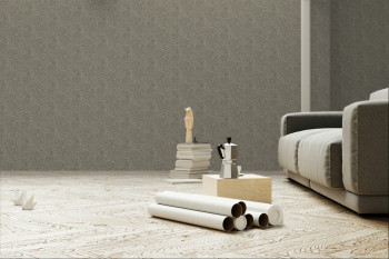 Delicately embossed non-woven wallpaper, stone terrazzo in shades of gray-brown and silver, black background.