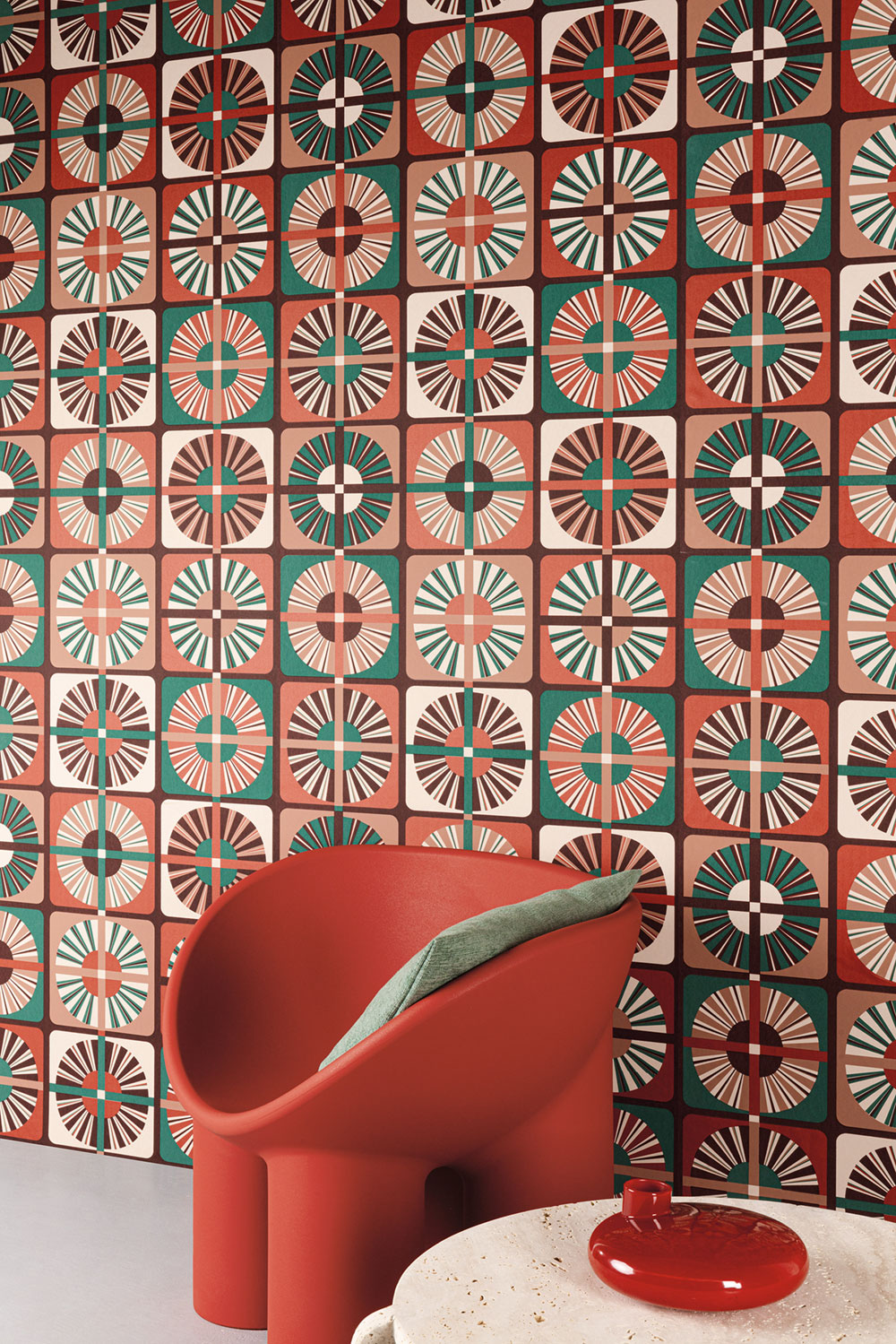 Gently embossed non-woven wallpaper, graphic retro pattern in shades of green, brick, beige, brown and black.