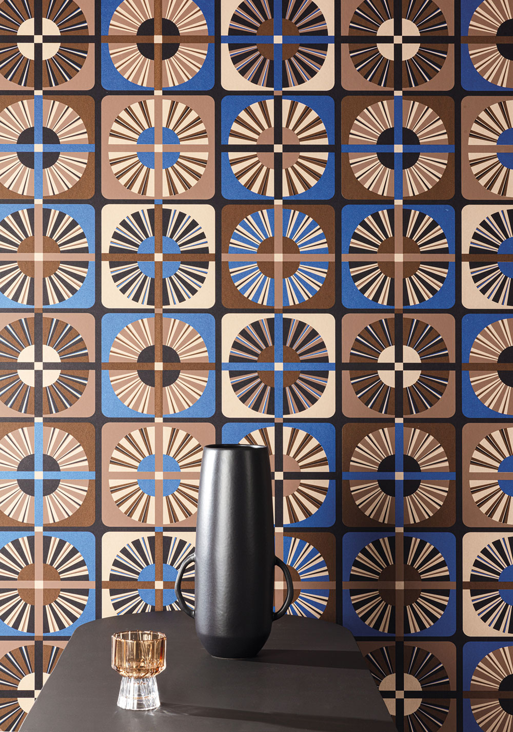 Gently embossed non-woven wallpaper, graphic retro pattern in shades of cream, beige, brown, black and semi-gloss green.