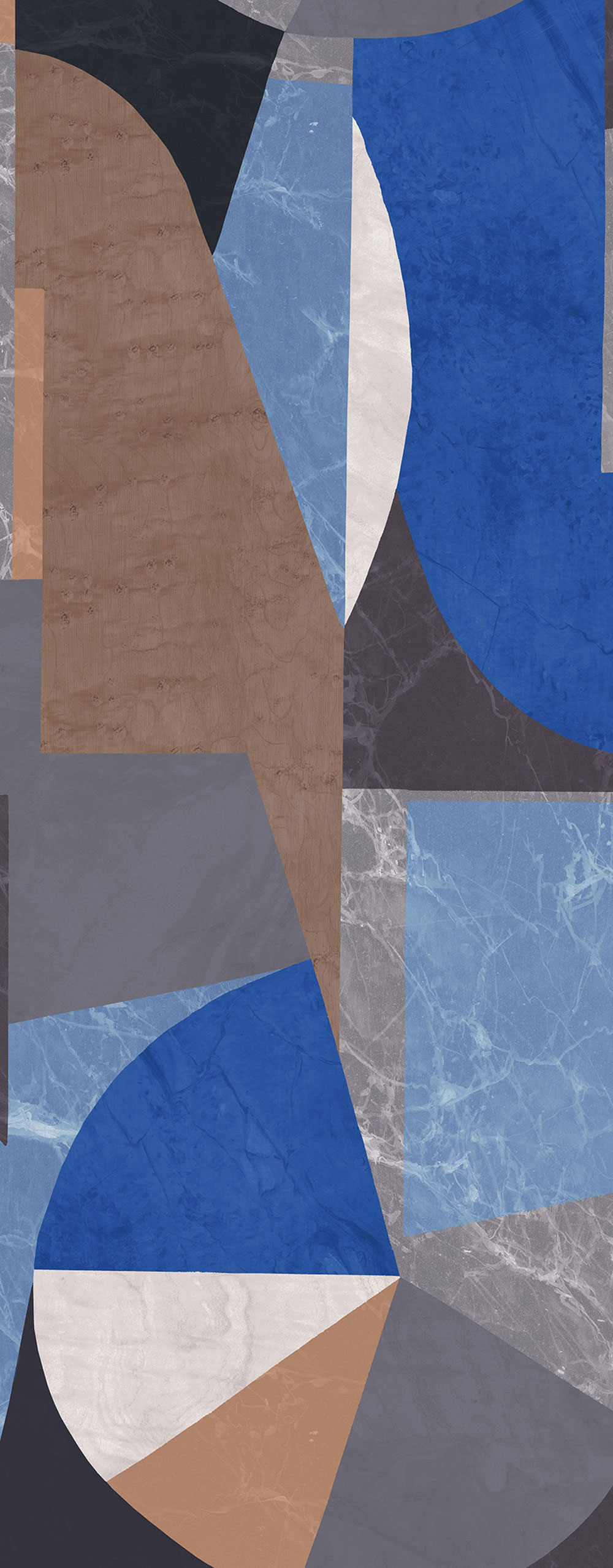 Graphic non-woven wall mural, shades of blue, grey, brown, black and beige.