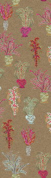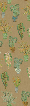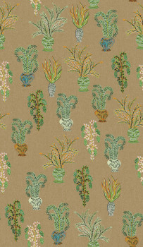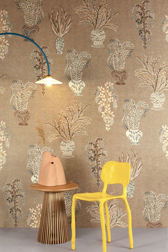 Non-woven wallpaper, coarser fabric texture, vase plant motifs, shades of khaki, brown, blue, green.