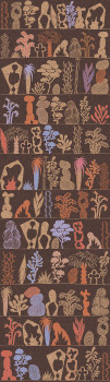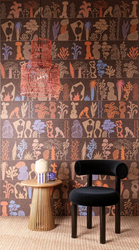 Non-woven wallpaper, coarser fabric texture, plant and mineral motifs on the shelves, shades of brown, purple and brick red.