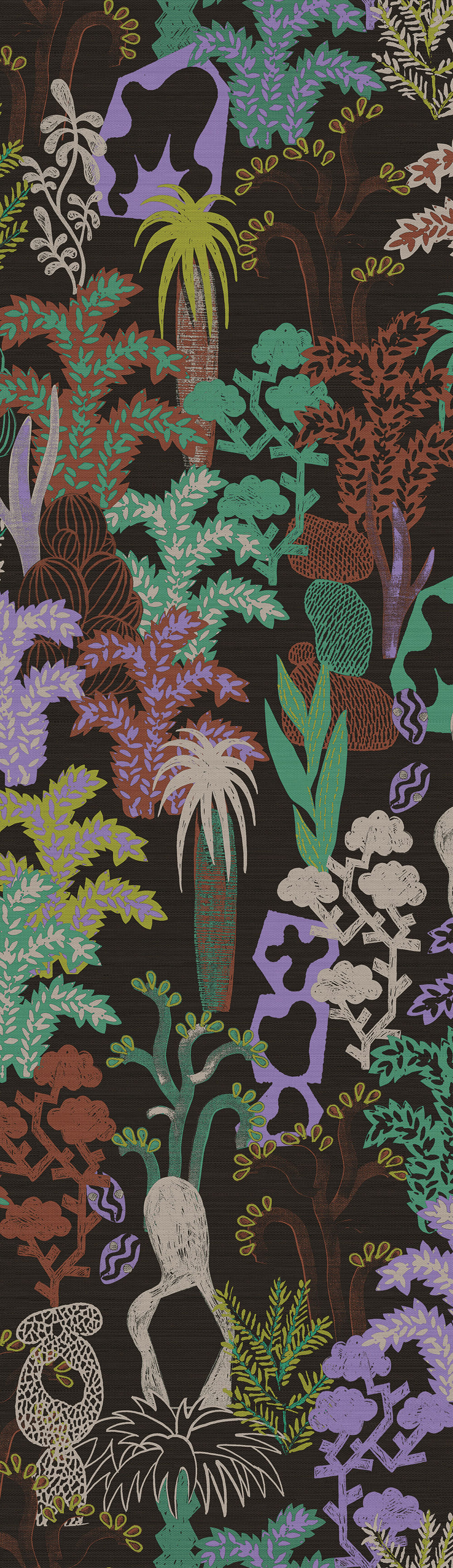Non-woven wallpaper, coarse fabric texture, plant motifs, shades of black, green, purple, brown and gray.