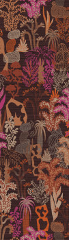 Non-woven wallpaper, coarse fabric texture, plant motifs, shades of brown, pink, orange.