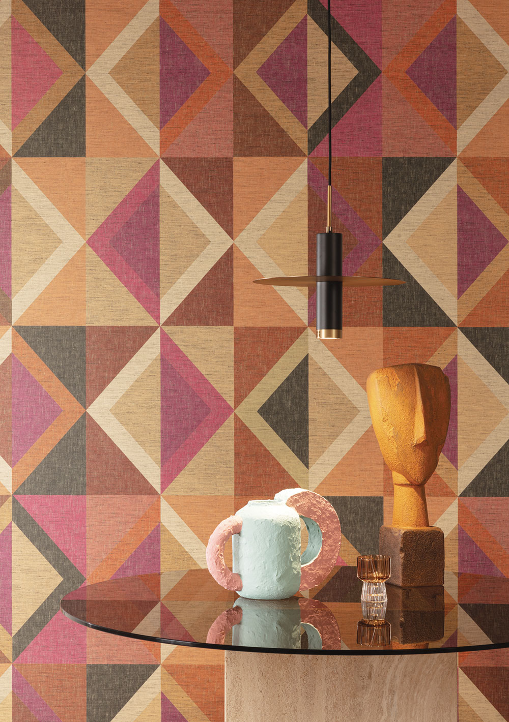 Geometric non-woven wallpaper, coarse fabric texture, shades of brown, purple, orange and beige.