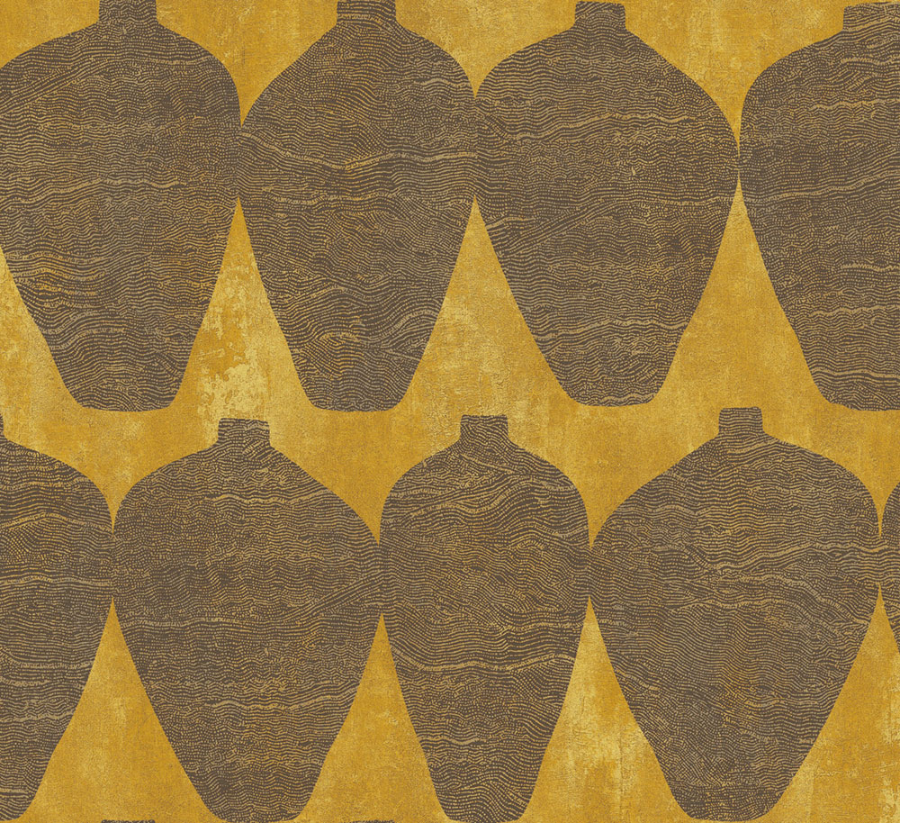 Non-woven wallpaper, delicately embossed vase pattern in shades of brown and gold, semi-gloss saffron yellow background.