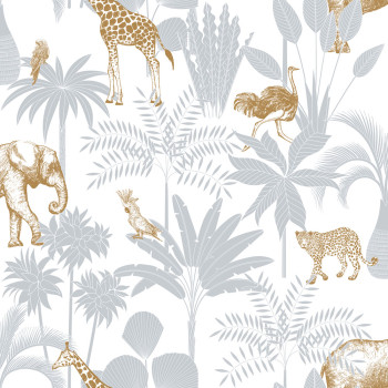 White non-woven wallpaper, motifs of wild animals and palm trees, shades of green and ocher.