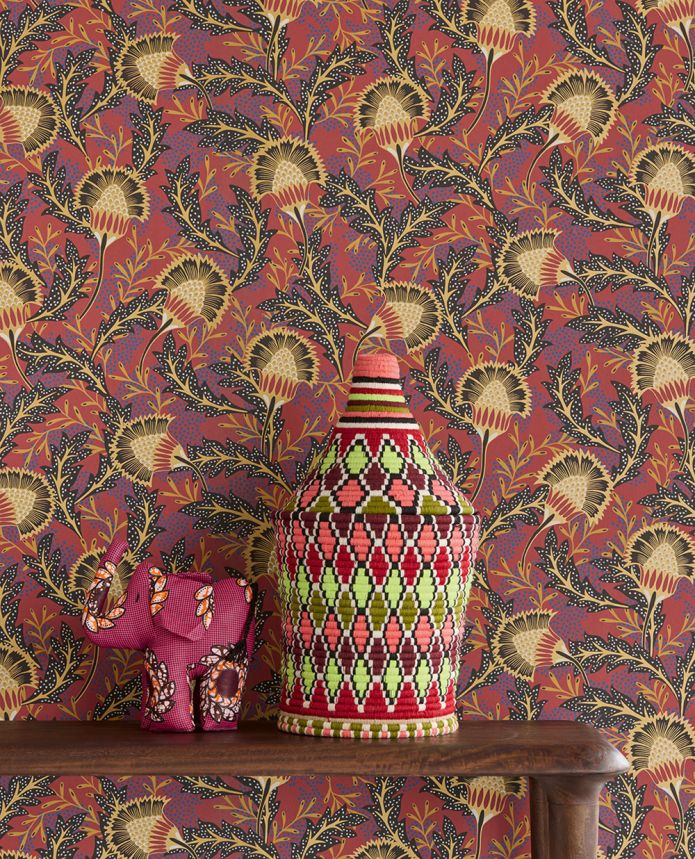 Burgundy non-woven wallpaper, unconventional floral pattern inspired by African batik, gold flowers and parts of leaves, other colors - blue, black, brown.