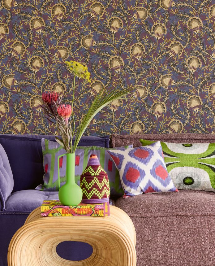 Eggplant non-woven wallpaper, unconventional floral pattern inspired by African batik, gold flowers and parts of leaves, other colors - blue, black, khaki.