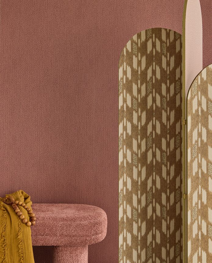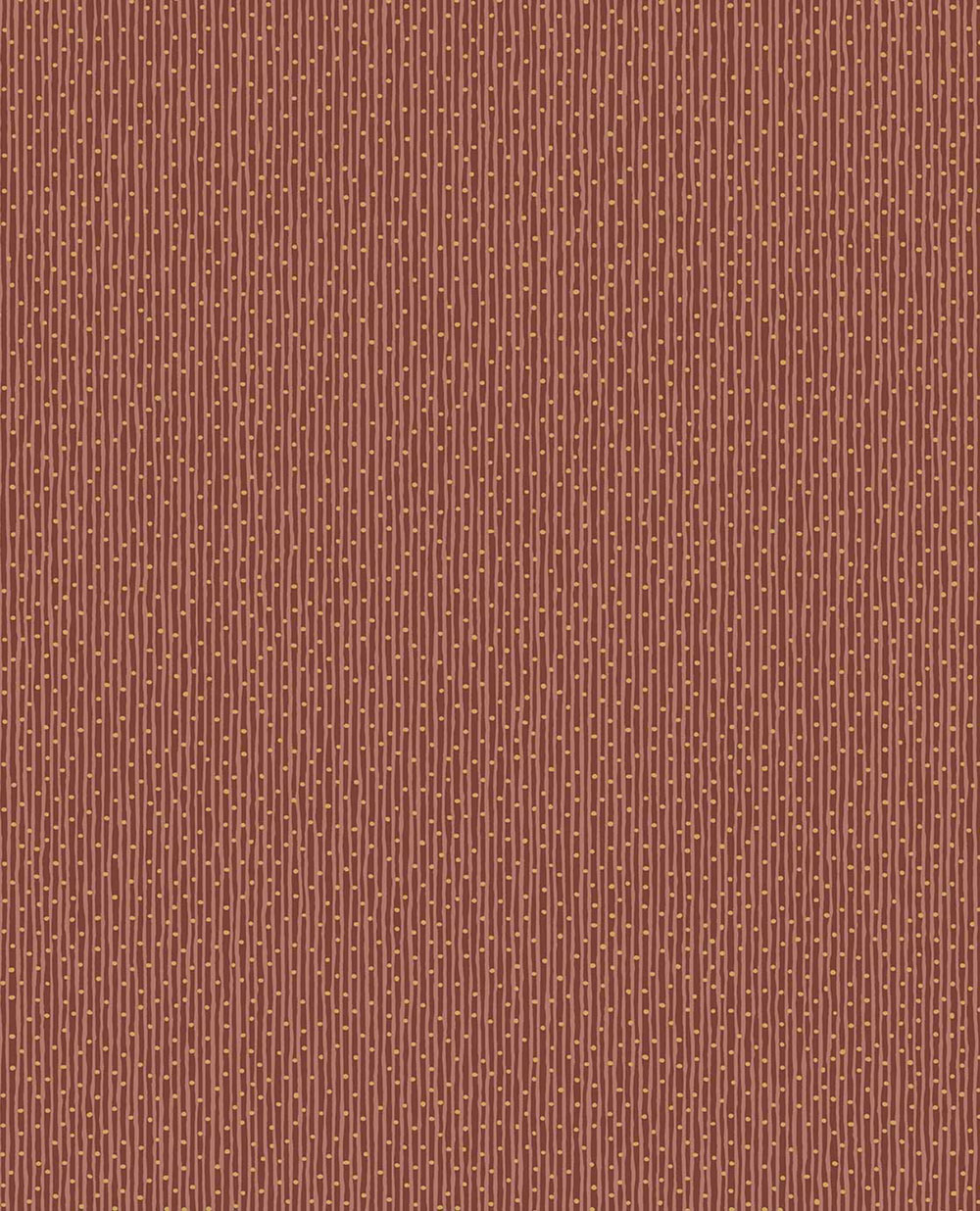 Non-woven wallpaper, irregular stripes in shades of burgundy, small gold dots.