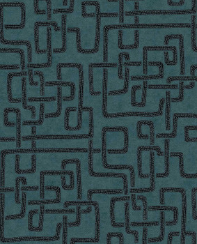 Gently embossed non-woven wallpaper, fabric look, shades of blue / petrol, in a pattern with metallic accents.