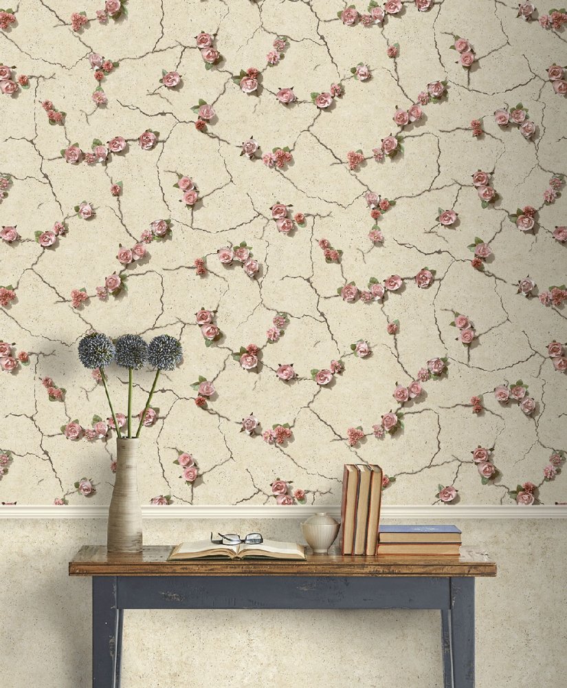 Impressive design of roses growing through a concrete wall. Wallpaper texture - finely structured washable, soft, vinyl. Wallpaper suitable for the hallway, corridors, bedroom, but also for living room. Combine with related patterns.