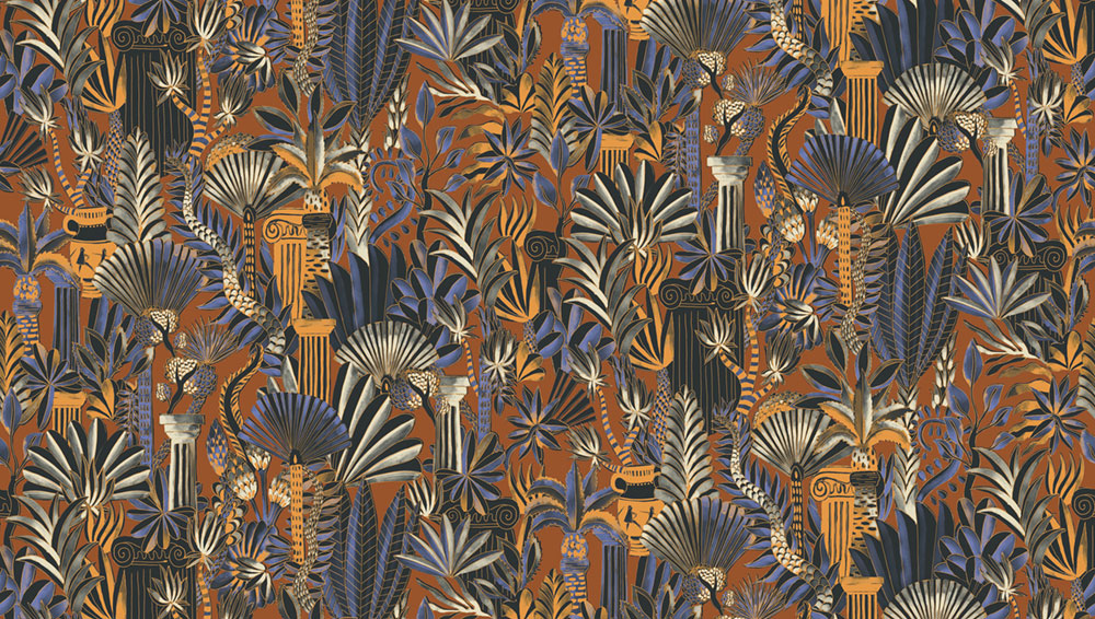 Non-woven wall mural, Tresor - motifs of plants, palm trees, historical columns and vases. A design wall mural will make your interior cozy and create a pleasant atmosphere.