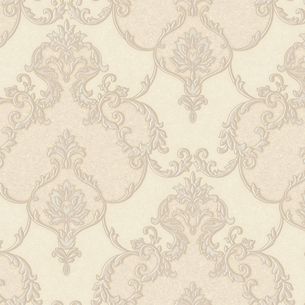 Luxurious beige non-woven wallpaper, baroque pattern with semi-gloss, small glitters.