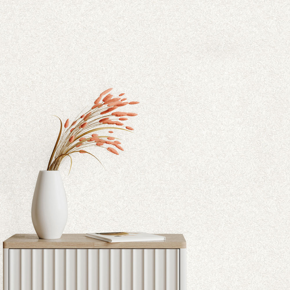 Luxurious light grey non-woven wallpaper, baroque stucco pattern with small glitters.