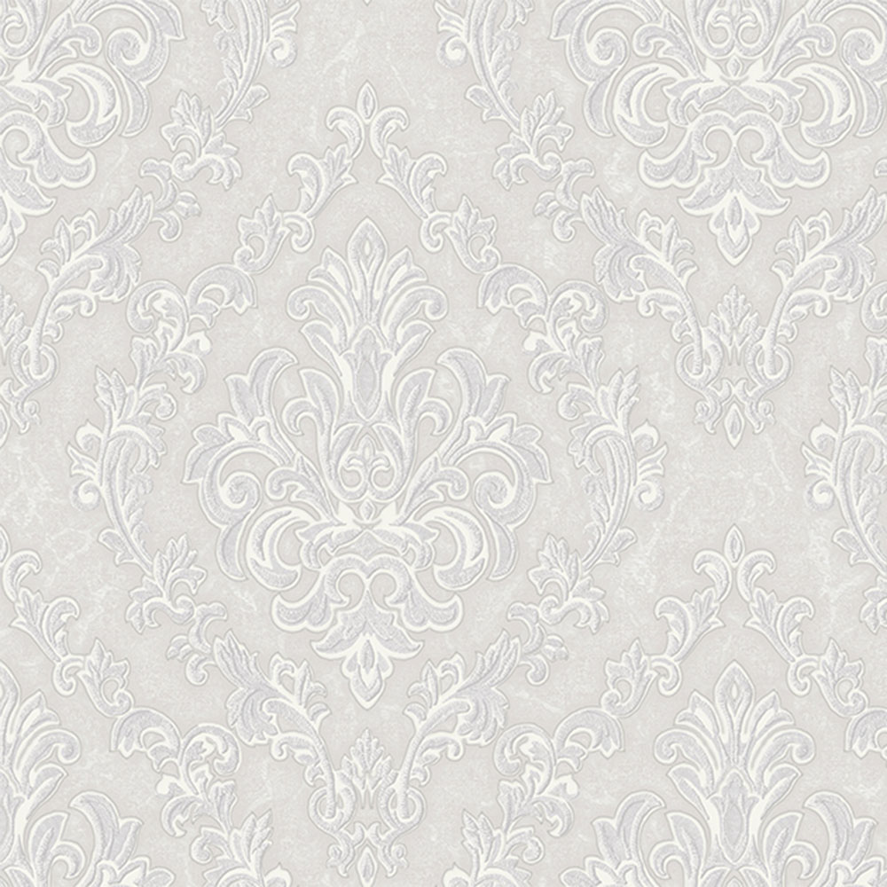 Luxurious grey non-woven wallpaper with vinyl surface, semi-glossy baroque pattern with small silver glitters.