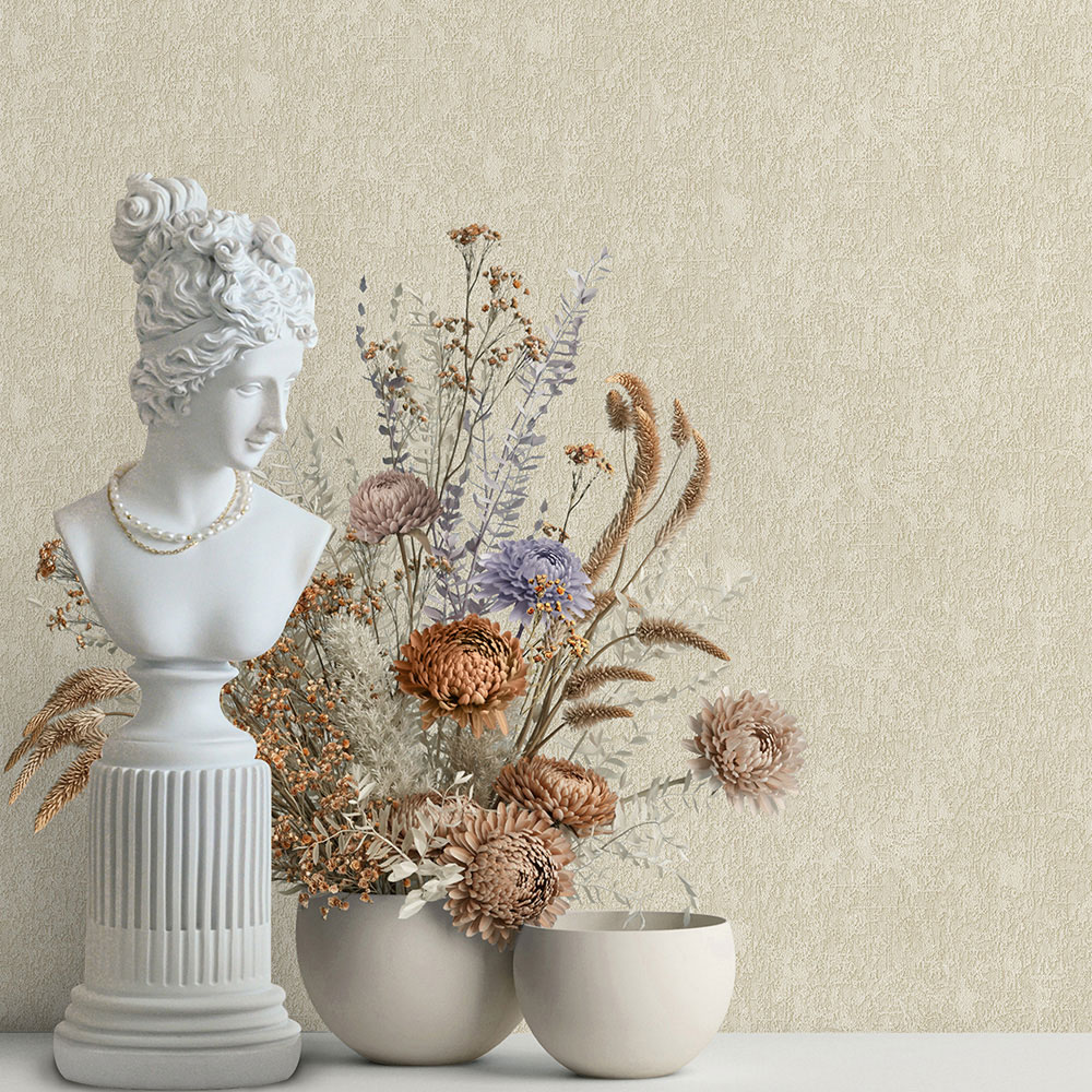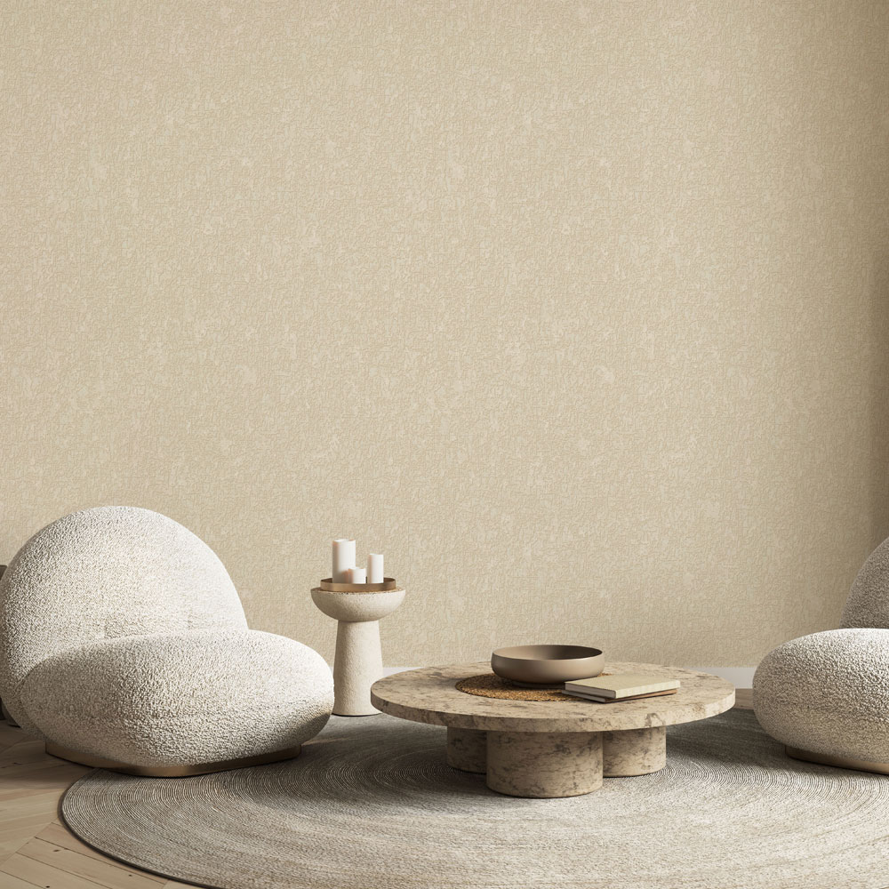 Luxurious beige non-woven wallpaper, baroque stucco pattern with small gold glitters.