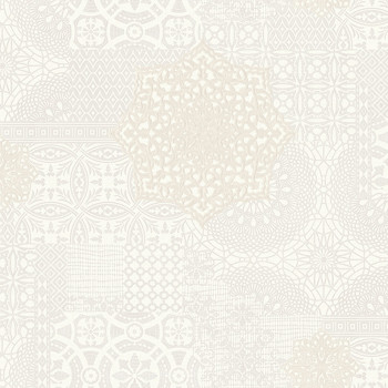Luxurious cream non-woven wallpaper, imitation of embroidery and lace, small silver glitters in places.