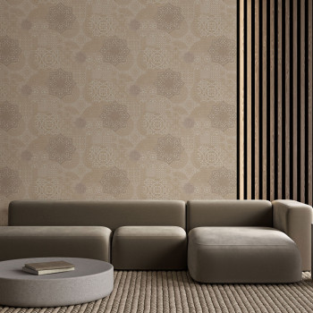 Luxurious brown-beige non-woven wallpaper, imitation of embroidery and lace, small glitters in places.
