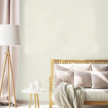 Luxurious cream-white non-woven wallpaper, fabric imitation, small silver glitters in places.