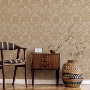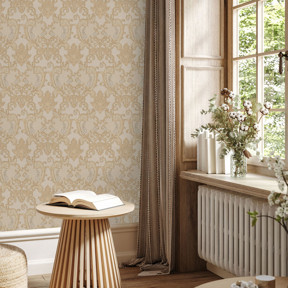 Luxurious light beige non-woven wallpaper, baroque pattern with gold-beige semi-gloss, small gold glitters.