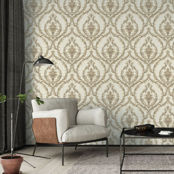 Luxurious light beige non-woven wallpaper, brown baroque pattern with small gold glitters.