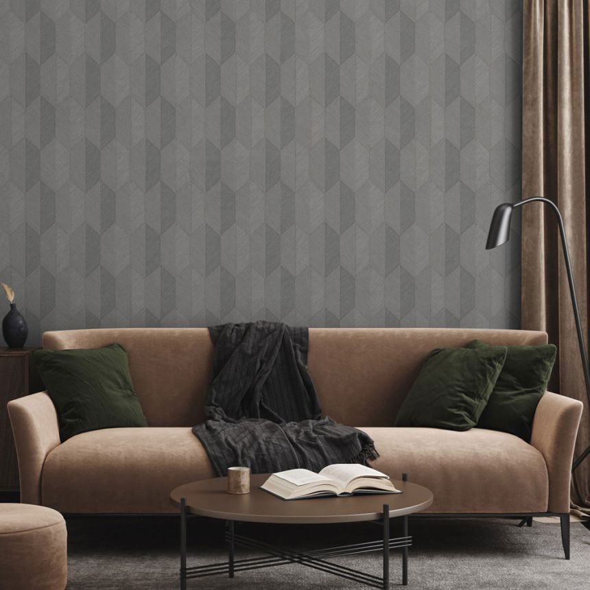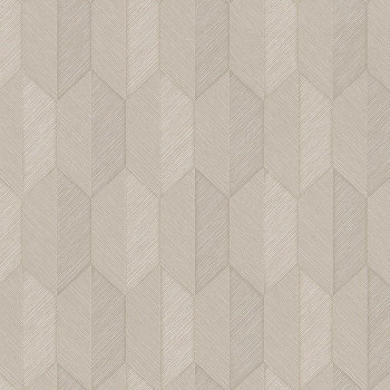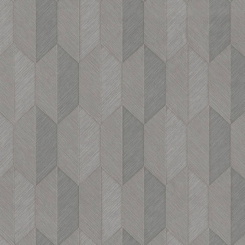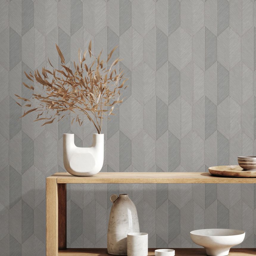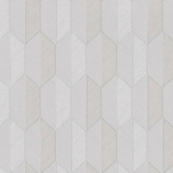 Semi-glossy non-woven wallpaper with vinyl surface, structured geometric pattern in shades of gray and gray-beige.