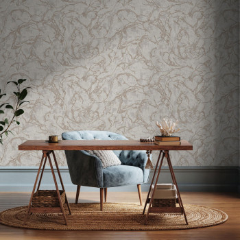 Luxury non-woven wallpaper with vinyl surface, gray-beige background with metallic semi-gloss, marbling with bronze gloss.