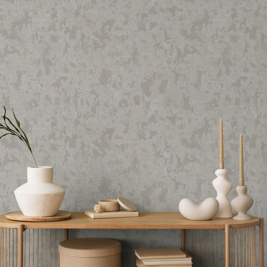Luxury non-woven wallpaper with vinyl surface, stucco pattern, gray-beige semi-gloss.