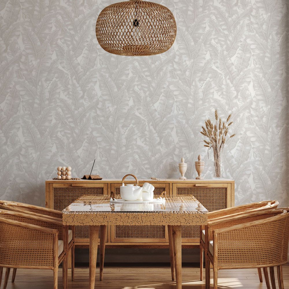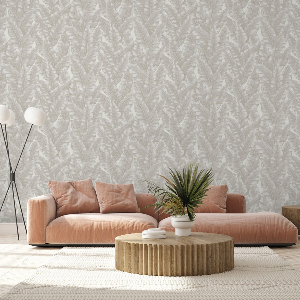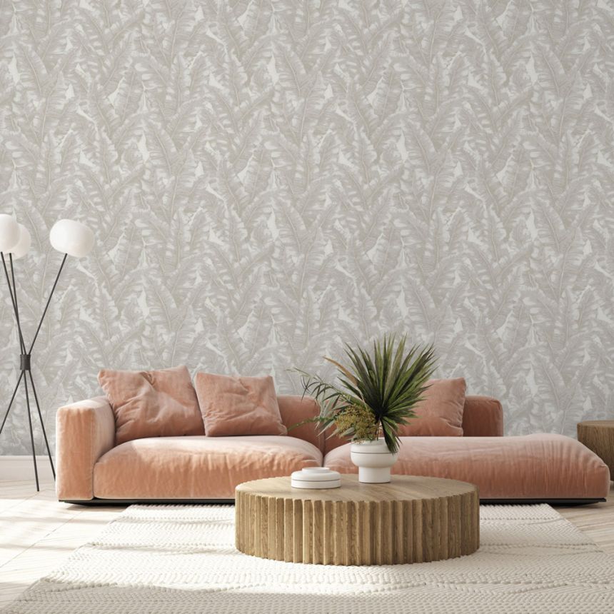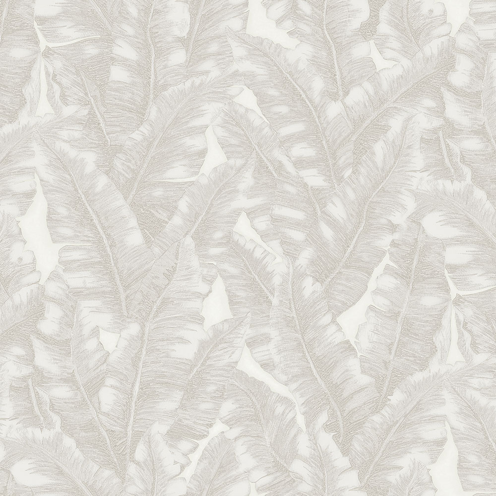 Luxury non-woven wallpaper with vinyl surface, banana leaf motifs in semi-gloss cream shades.