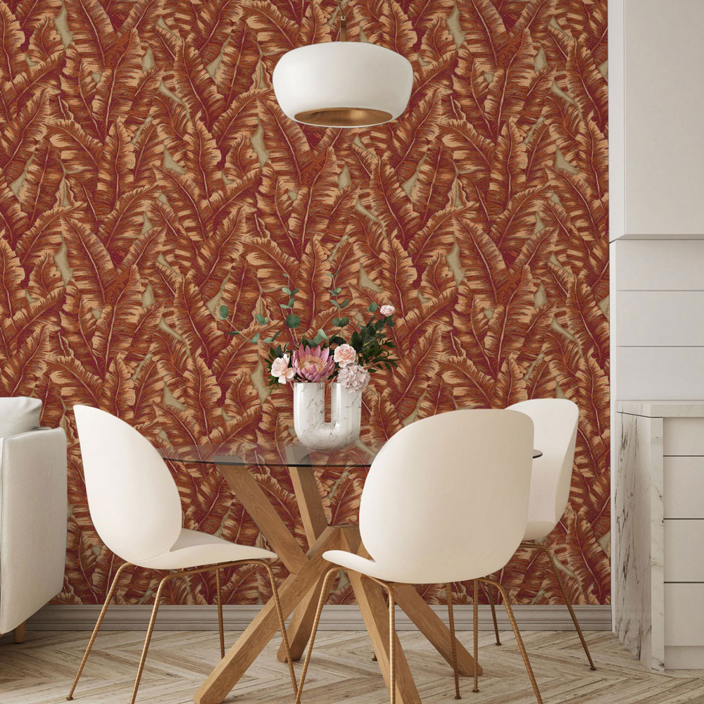 Luxury non-woven wallpaper with vinyl surface, banana leaf motifs in shades of semi-gloss orange, ochre and brick red.