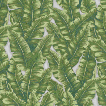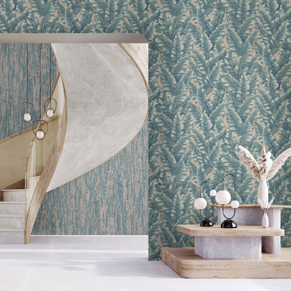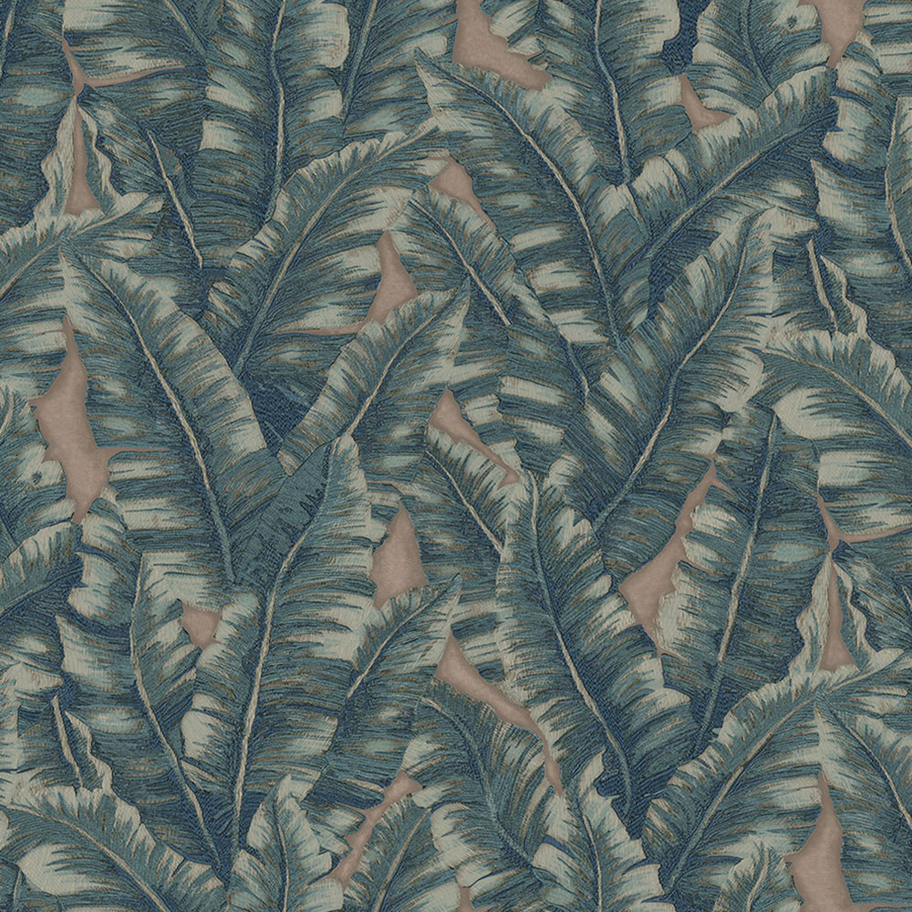Luxury non-woven wallpaper with vinyl surface, banana leaf motifs in shades of semi-gloss blue and brown.