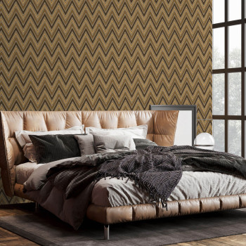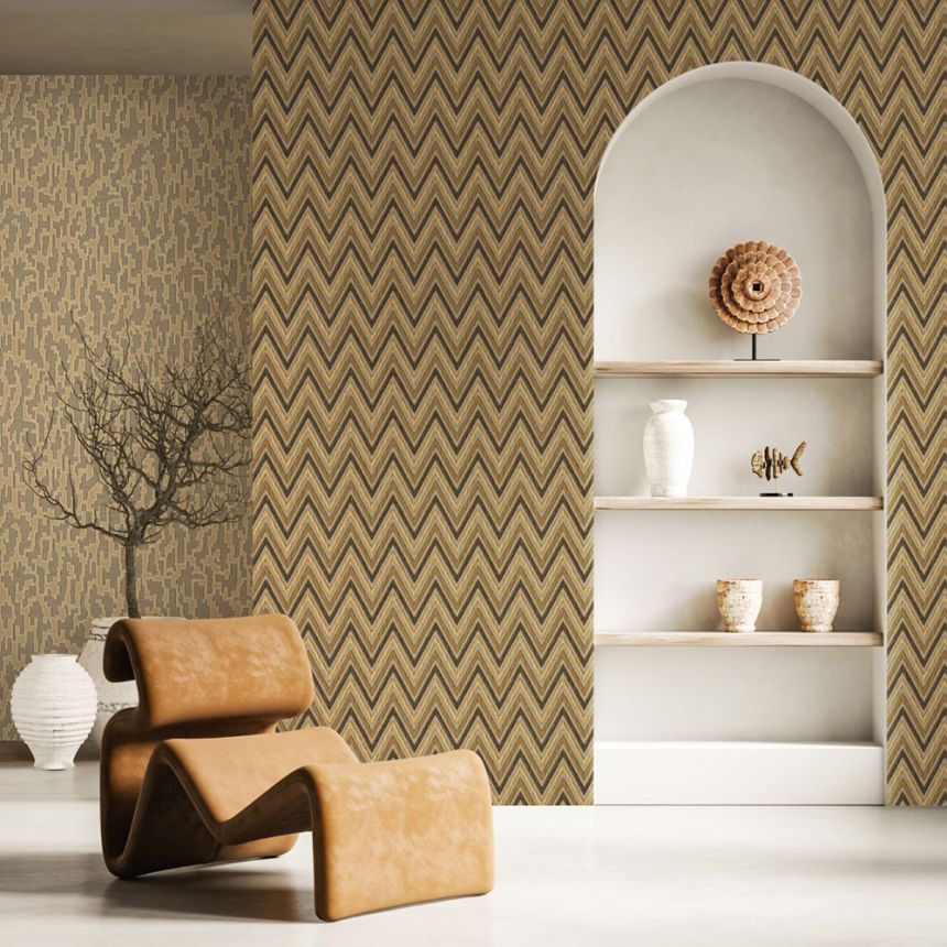 Non-woven wallpaper with vinyl surface, zigzag pattern in shades of brown and brown-gold.