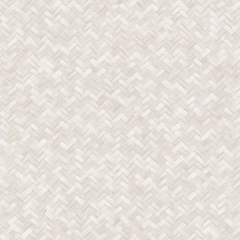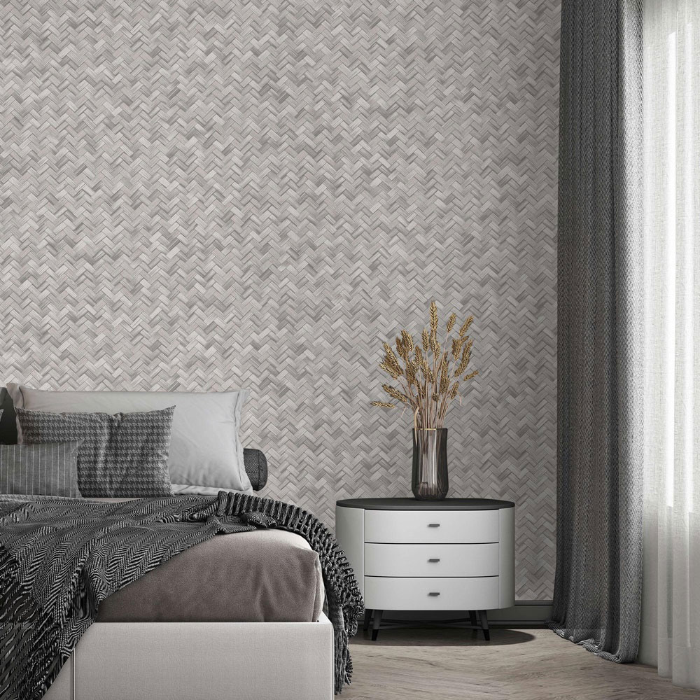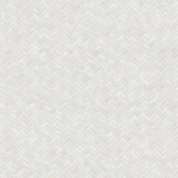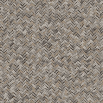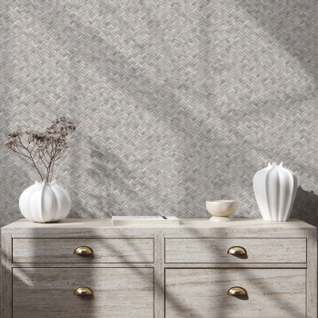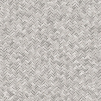 Non-woven wallpaper with vinyl surface, imitation of bast mat, shades of semi-glossy gray.