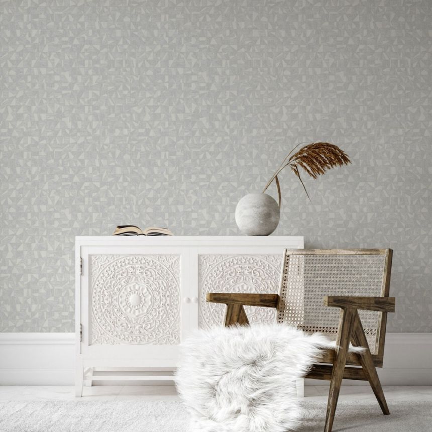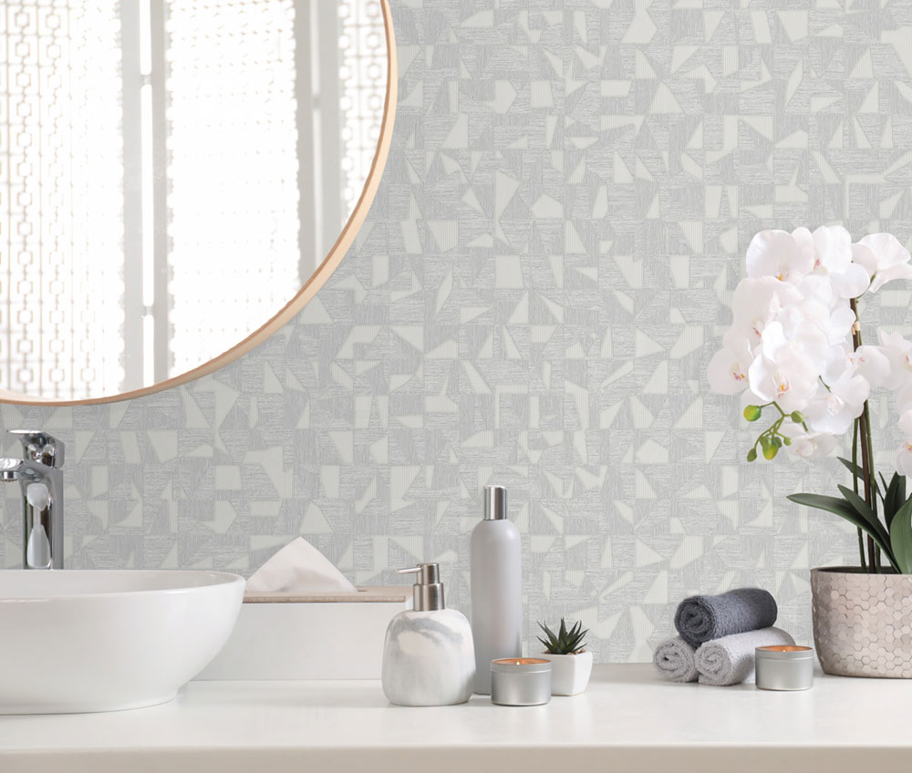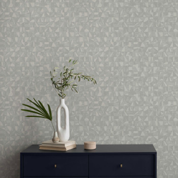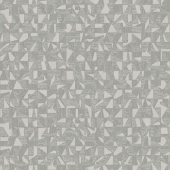 Geometric non-woven wallpaper with vinyl surface, effective texture alternation, shades of gray with silver reflections.