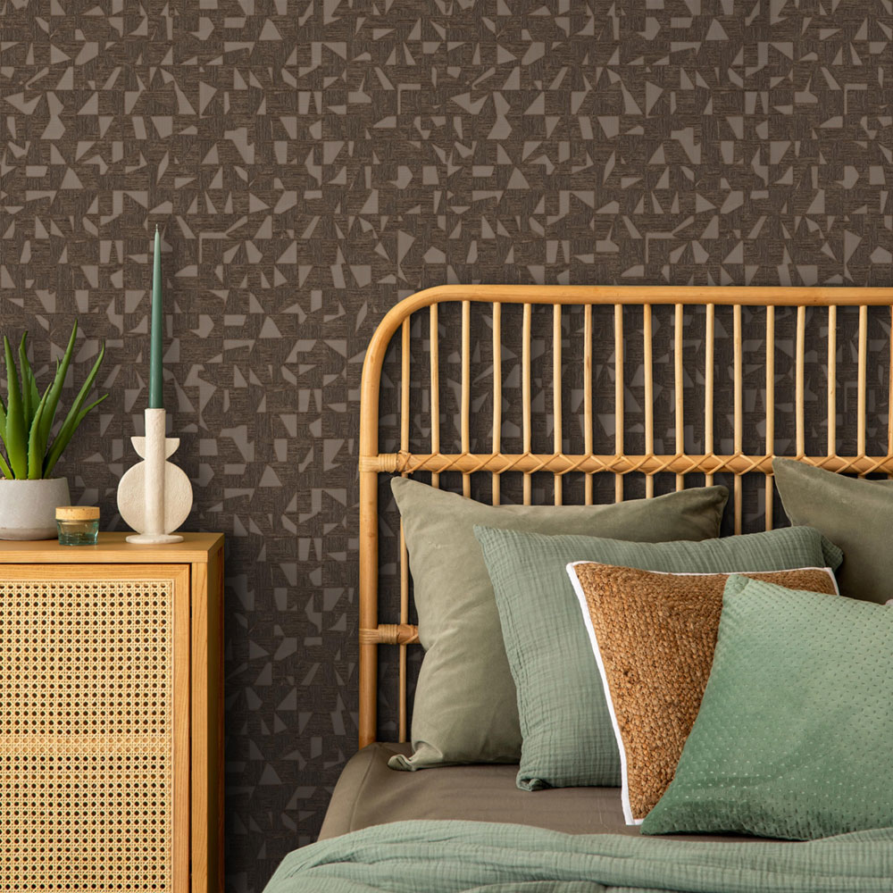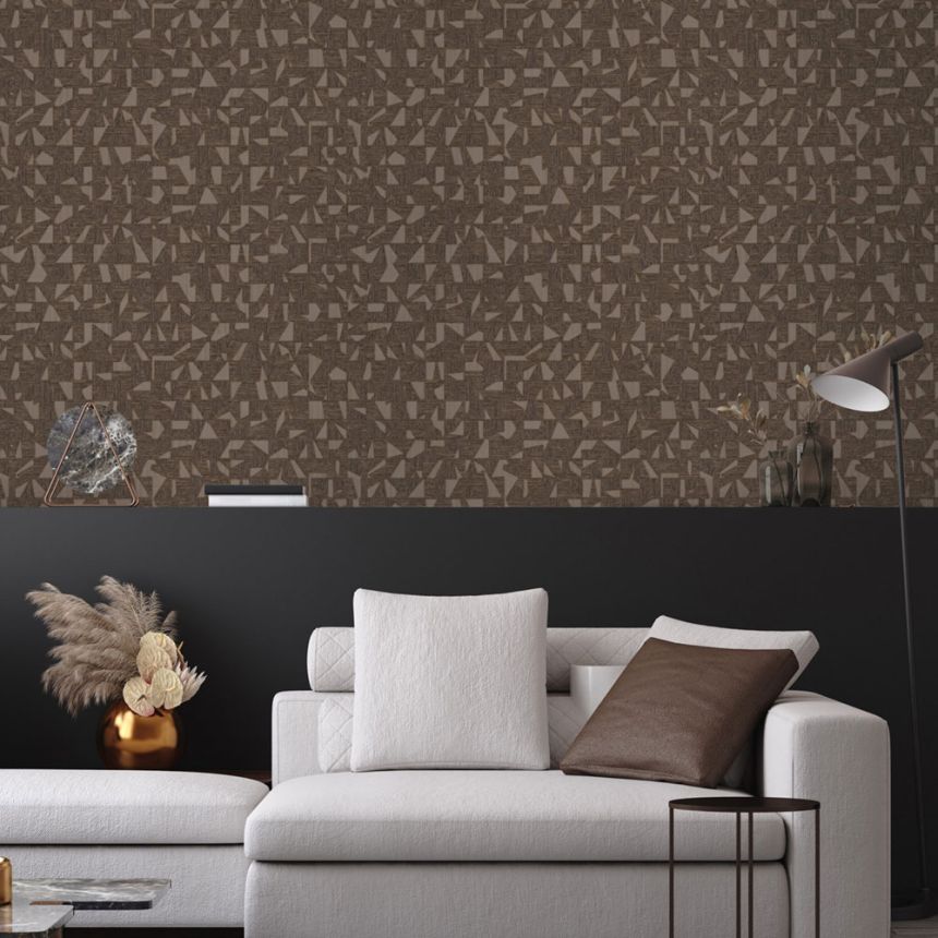 Geometric non-woven wallpaper with vinyl surface, effective texture alternation, shades of brown with bronze reflections.