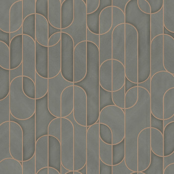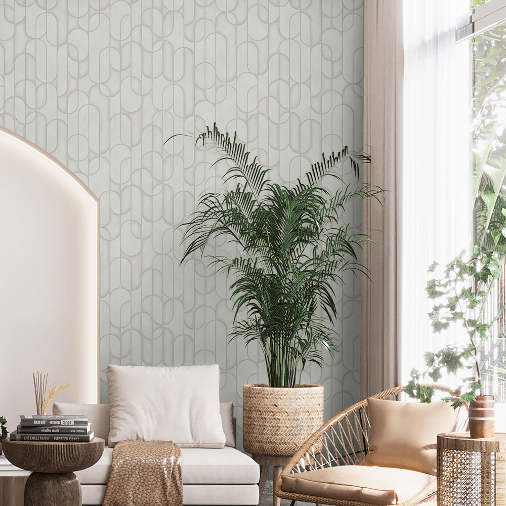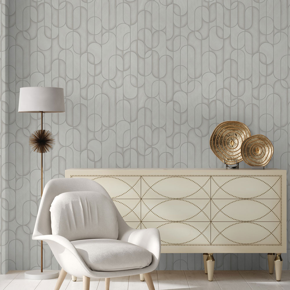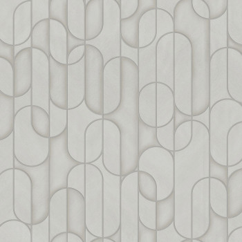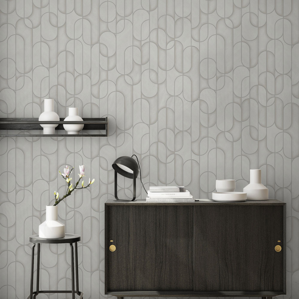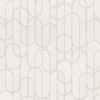 Geometric non-woven wallpaper with vinyl surface, effective texture alternation, shades of gray, smooth silver outlines.