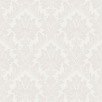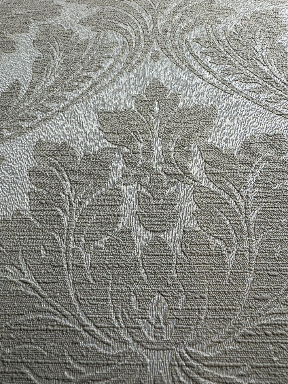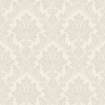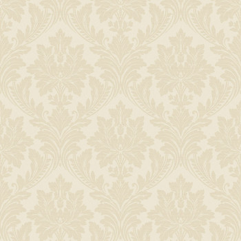 Beige non-woven wallpaper with baroque damask pattern, fabric texture, delicate semi-gloss background.