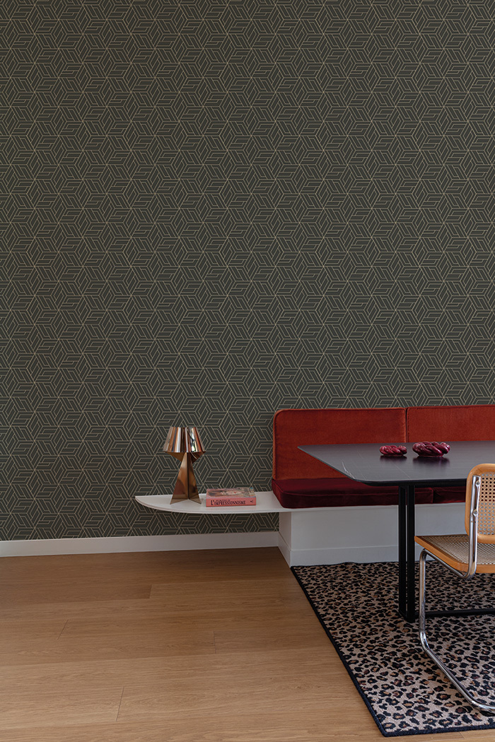 Black embossed geometric non-woven wallpaper, golden outlines.
