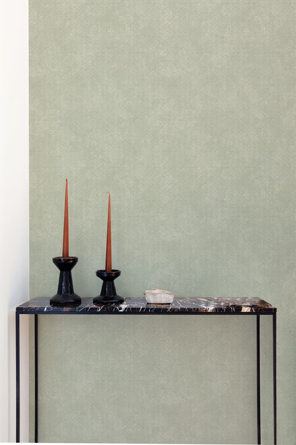Geometric non-woven wallpaper, shades of green, small metallic glitters.