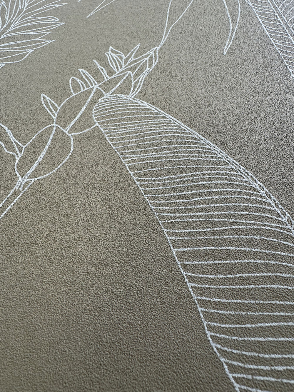 Beige non-woven wallpaper, outlines of tropical leaves.