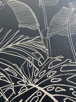 Blue non-woven wallpaper, gray outlines of tropical leaves.